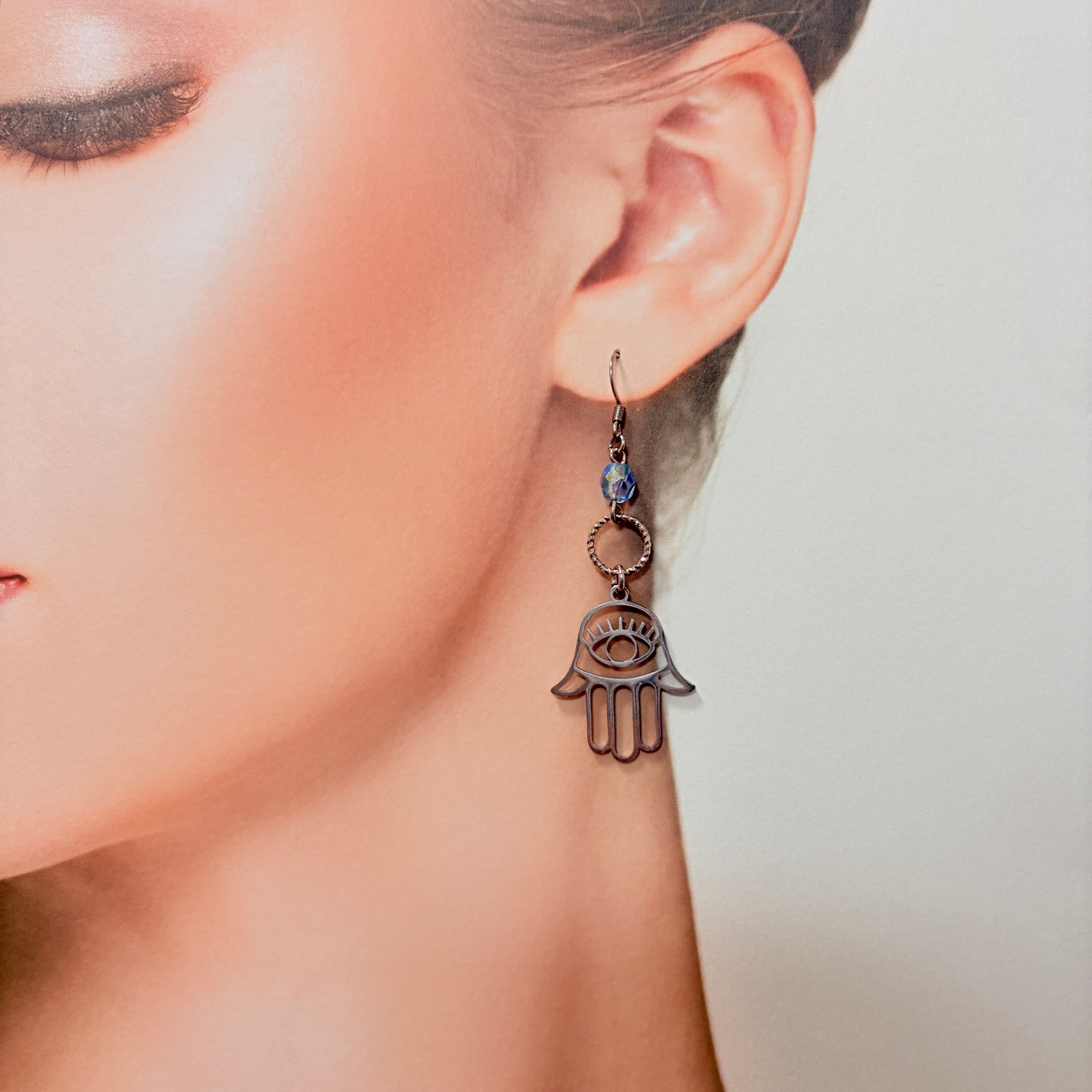 視線を引き寄せるアイモチーフとハムサの組み合わせ。繊細に揺れるビーズが光を受け、神秘的な存在感を放ちます。シンプルながらも印象的で、日常の装いにさりげない強さと個性をプラスします。