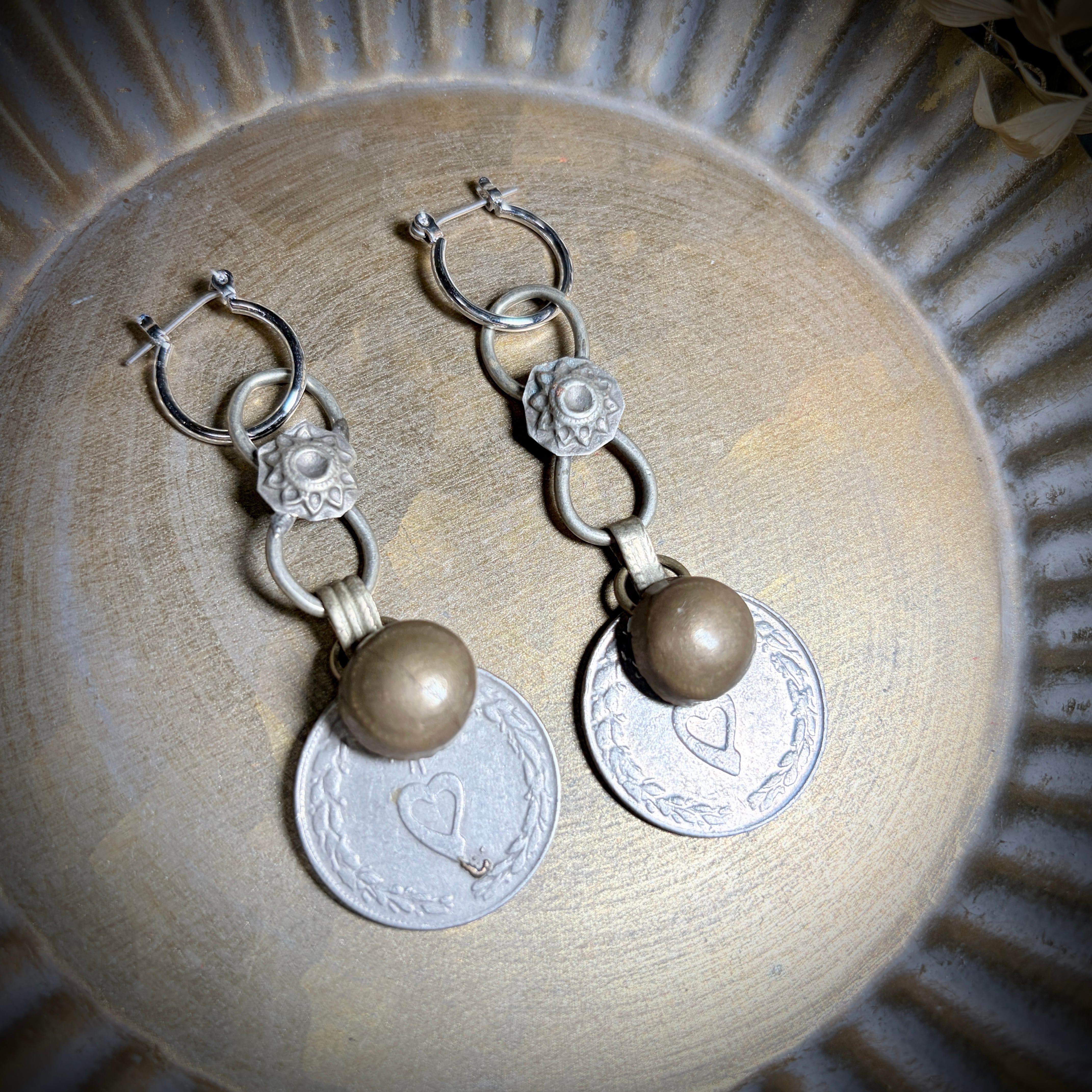 旅先で見つけたお守りのような、ストーリーを感じさせるオールドコインが印象的なピアス。マットな質感と程よい重みが、大人の装いにしっくりと馴染みます。動くたびに揺れる重厚なシルエットが、シンプルなコーディネートにも奥行きと存在感をプラスします。