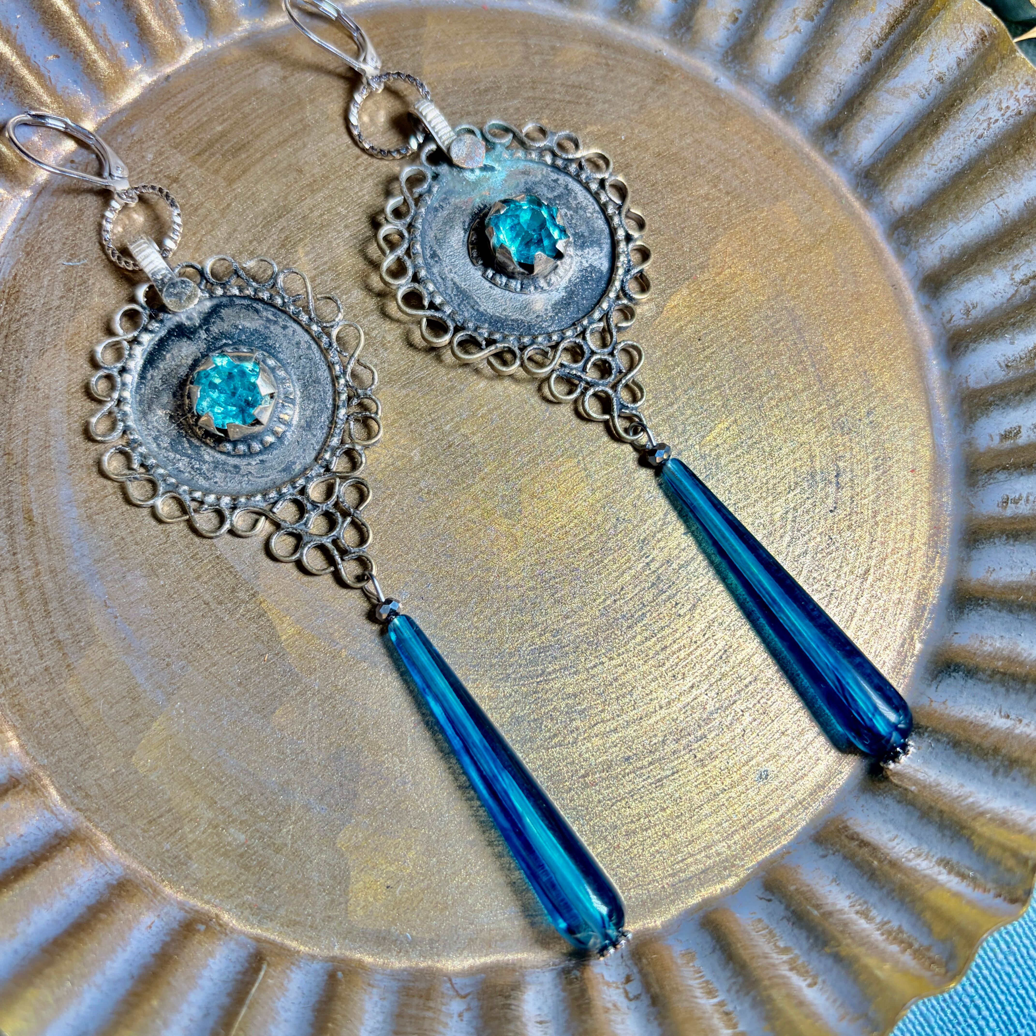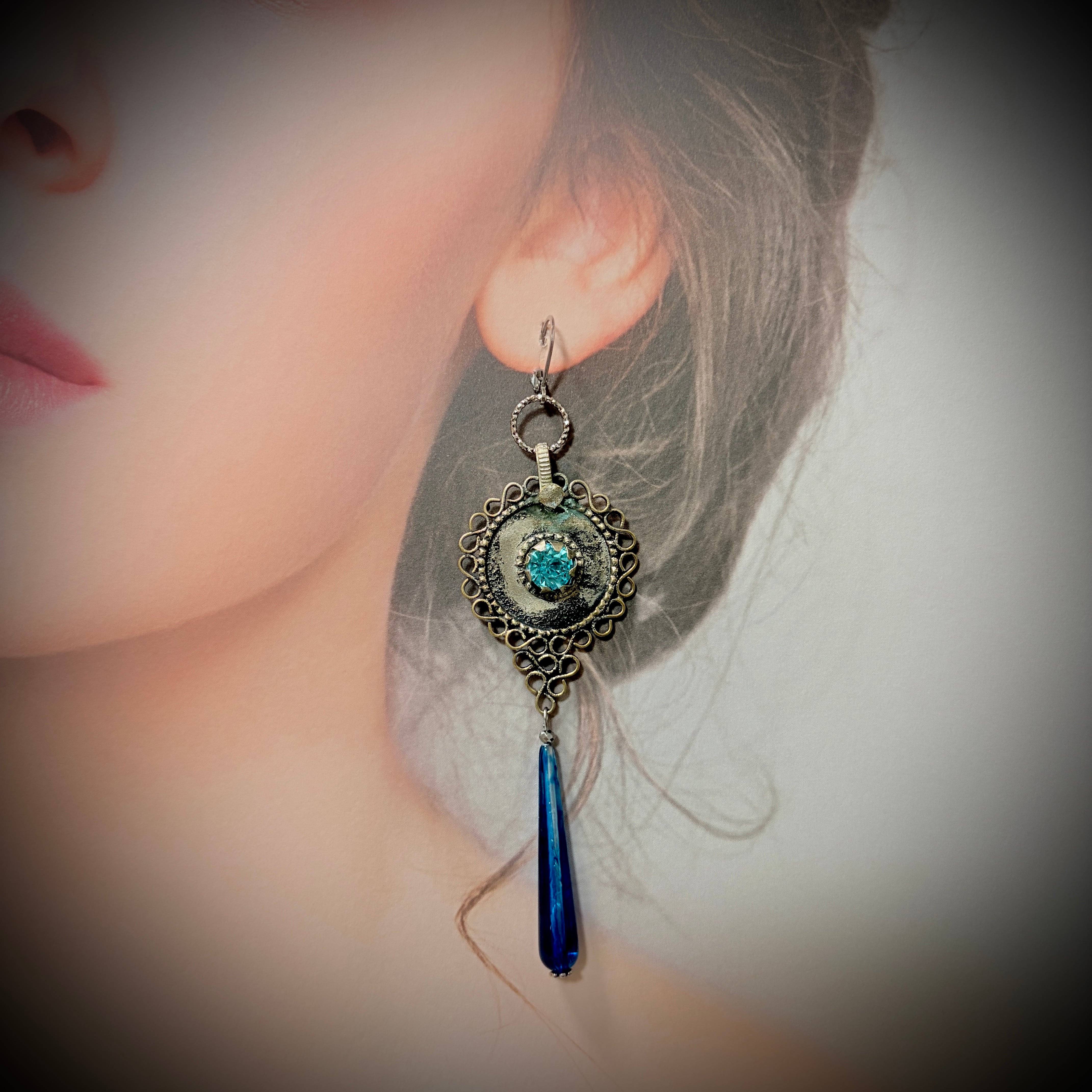 繊細な装飾が施されたオールドパーツに、深いブルーが印象的なドイツ製ロングドロップビーズを組み合わせたピアス。アンティークの風合いと透明感あるブルーが重なり、どこか神秘的で異国感のある仕上がりに。